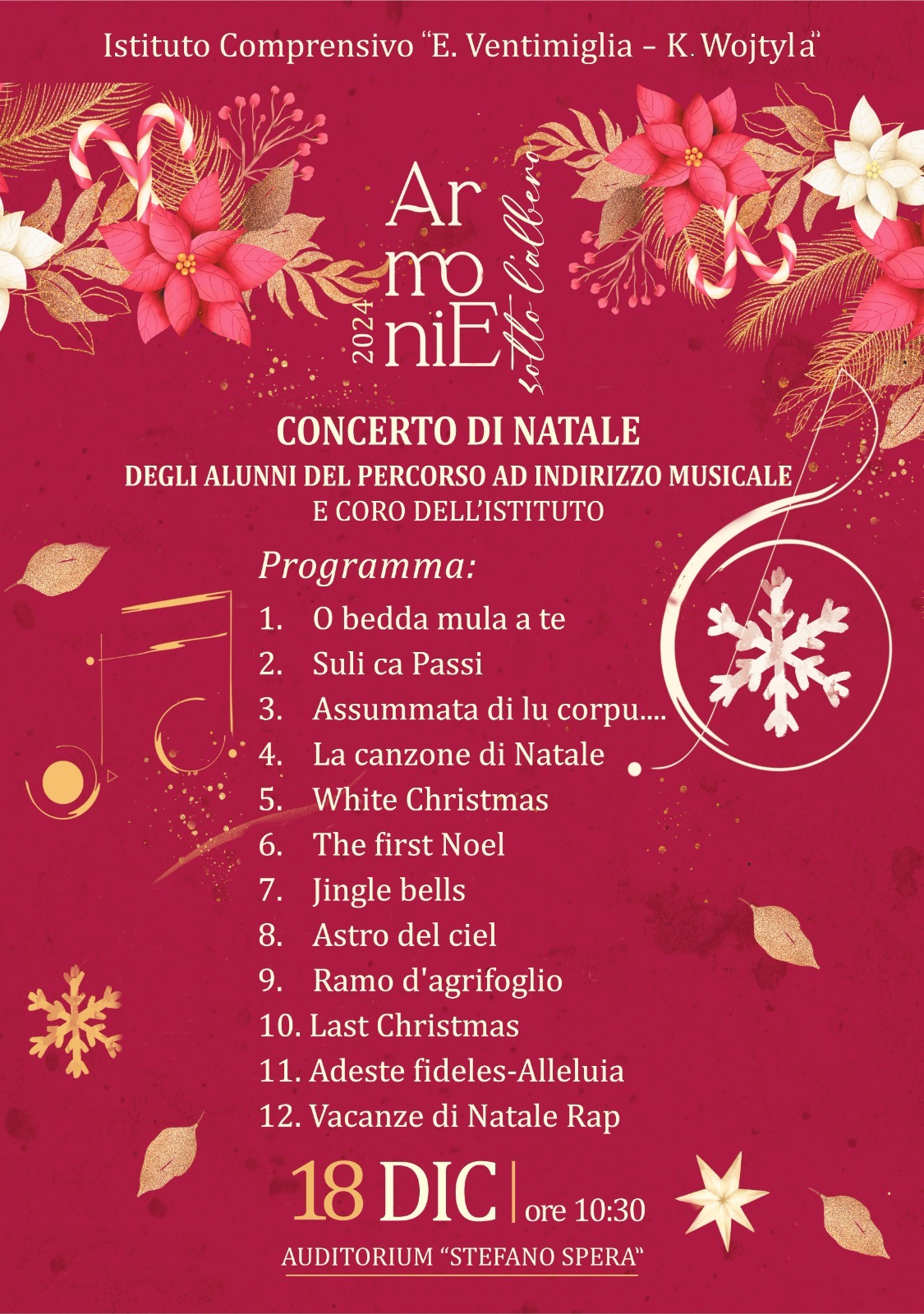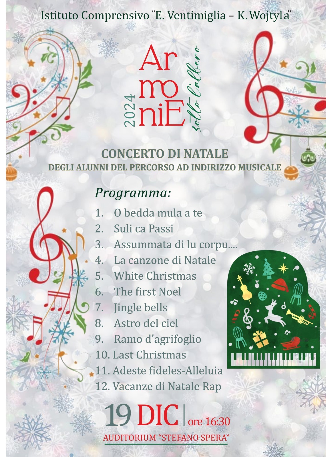 Il 18 e 19 Dicembre i ragazzi dell’indirizzo musicale della scuola secondaria di I grado ed il coro dell'istituto, si esibiranno in una performance musicale per augurare un sereno Natale ed un felice anno nuovo a tutta la comunità scolastica.